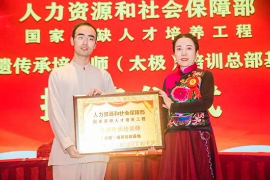 人力資源和社會(huì)保障部國(guó)家緊缺人才培養(yǎng)工程非遺傳承培訓(xùn)師(總部)基地主任賀虹女士向武當(dāng)和太極學(xué)院授牌作為(太極)培訓(xùn)總部基地, 執(zhí)行院長(zhǎng) 何強(qiáng)先生接受牌匾。
