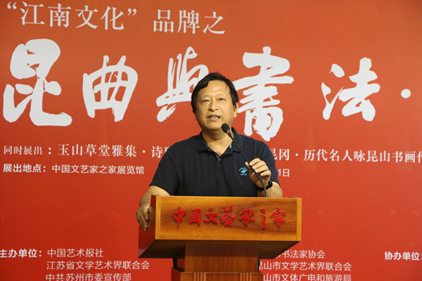 7月26日,由中國藝術報社、江蘇省文聯、蘇州市委宣傳部、江蘇省書協、蘇州市文聯、蘇州市文廣旅局、昆山市人民政府主辦的昆曲與書法·書法展在北京中國文藝家之家展覽館開幕。本次展覽分為“玉出昆岡——歷代名人詠昆山”“玉山雅集·詩聯作品”“昆曲與書法”三個部分,共展出霍國強等著名書畫家創作的作品近200幅。這些作品以歷代名人吟詠昆山的詩歌、古代三大雅集之一的“玉山雅集”以及昆曲為主線,采用書法和繪畫創作相結合的手法,展現昆山之美、昆曲之美、傳統之美。