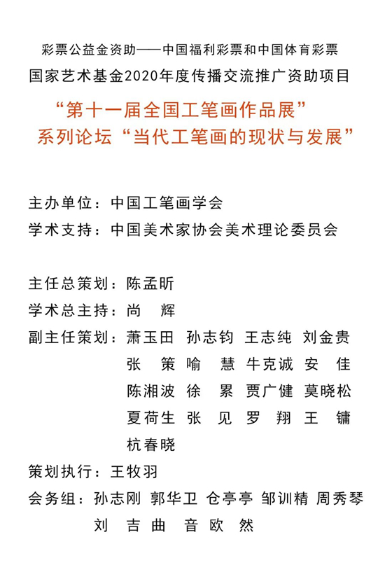 由中國美術家協會、中國美術館、中國工筆畫學會共同主辦的“第十一屆全國工筆畫作品展”,是2020年度國家藝術基金資助項目。因為疫情影響,一直延遲到2021年4月首展終于在中國美術館開幕,并先后在深圳關山月美術館、上海中華藝術宮、江蘇省淮安市美術館巡回展覽。工筆畫藝術及其內在的工筆畫精神,正在成為我們新時代的鮮明注腳。十一屆大展入選作品數量大,整體水平高,呈現了最有代表性的工筆畫創作面貌,也最集中地反映出當代工筆畫存在的各種問題。本論壇由中國工筆畫學會主辦,中國美術家協會美術理論委員會學術支持;中國工筆畫學會領導集體策劃,會長陳孟昕擔任總策劃,中國美術家協會美術理論委員會主任尚輝擔任學術總主持。論壇邀請當前國內最重要的工筆畫創作名家、美術理論家批評家及其他相關學者共同組成,以第十一屆全國工筆畫作品展為基礎,就“當下工筆畫的發展現狀”、“工筆畫在創作方面需研究的問題”、“工筆畫未來發展與呈現”等核心命題展開專題對話。論壇以四場高端學術對話的形式進行。每場邀請一位對當代美術有深入研究的理論家為主導,對話5位工筆畫相關創作及研究領域有重要成就的專家,以及非工筆領域的藝術大家。