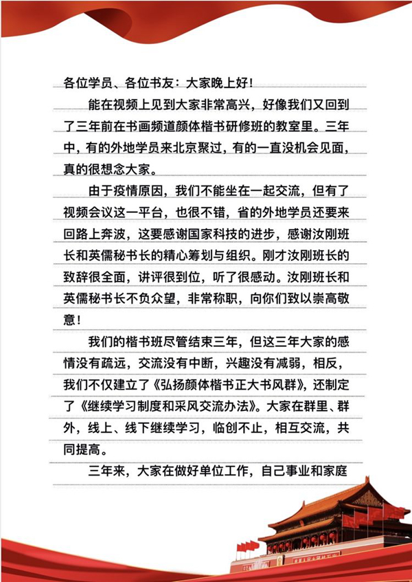 見面會由研修班秘書長李英儒主持,大家進入騰訊視頻會議室互致問候重溫師生情誼后,班長彭汝剛首先介紹了會議籌備情況,并總結介紹了過去三年來大家的學習情況及取得的不凡成績。隨后,研修班導師張銅彥發表熱情洋溢的講話。他指出,三年來,大家在做好單位工作、自己事業和家庭服務的同時,自覺學習,刻苦臨帖,勇于探索,認真實踐,字內功和字外功都有了顯著提高。他強調,學海無涯,藝無止境,在接下來的日子里,希望大家一是要謙虛謹慎,戒驕戒躁,不忘初心,砥礪前行,始終保持濃厚的學習興趣,再難也要堅持,再累也不放棄;二是要繼續堅持讀帖、臨帖,以顏勤禮碑為基礎,適當擴展自書告身帖、麻姑仙壇記、李玄靖碑等經典顏楷碑帖,做到生命不息,臨帖不止,活到老學到老;三是要臨創結合,學以致用,活學活用,重點解決“臨創兩張皮”的問題;四是要加強字外功的學習和積累,做到“藝文兼備”、“德藝雙馨”;五是要積極參加各級書法展覽和社會書法公益慈善活動,服務社會,服務人民;六是要積極參加研修班組織的各種集體活動,多提合理化建議,共同營造和諧向上、友善互助、生動活潑的良好風氣和團體氛圍。
