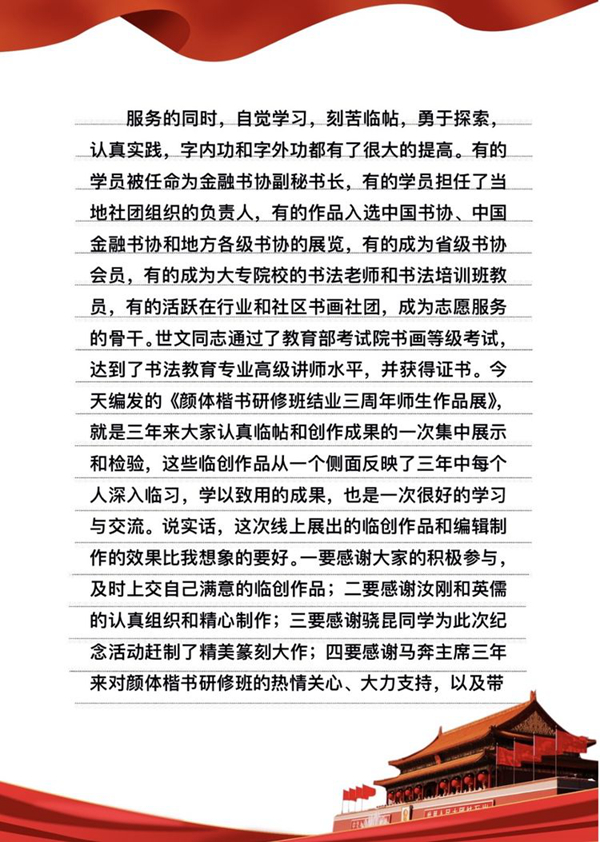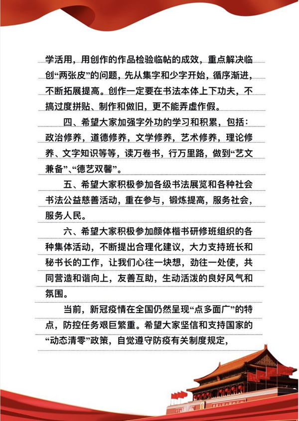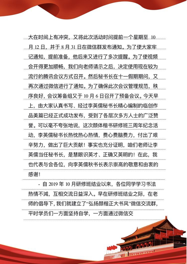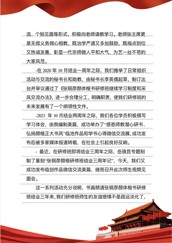 早在2019年10月,央視書畫頻道在北京舉辦了張銅彥顏體楷書研修班,來自全國各地的12名學員報名參加培訓。培訓班結業后,為了能繼續跟隨張銅彥老師學習,學員們強烈要求建立了微信交流群,張老師將其命名為“弘揚顏楷正大書風群”,并通過微信無償對大家繼續教學。2020年10月結業一周年之際,他們制訂出臺了《張銅彥顏體楷書研修班繼續學習制度和采風交流辦法》。2021年10月結業兩周年之際,研修班舉辦了“感恩師教潛心研書、弘揚顏楷正大書風”學書心得微信交流展。