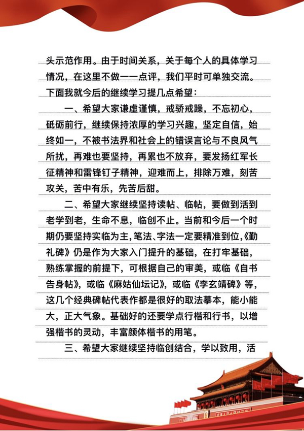 馬奔主編做了即興發言,他結合自身學書感受,介紹了自己跟隨老師張主席的學習成長經歷,認為大家學書的路子正、方向準、動力足,并對各位學員提出了良好建議。接著,各位學員也逐一進行了發言,大家談體會,說感想,各抒己見,暢所欲言。老師張銅彥在每人發言之后逐個進行點評,既一絲不茍精準到位,又真誠中肯熱心鼓勵。學員們一致認為,老師張銅彥作為當代顏楷名家,能給學員這么近距離長時間的義務精心指導,確實是德藝雙馨令人感動,仿佛光一樣照射和溫暖著每一個人的內心。