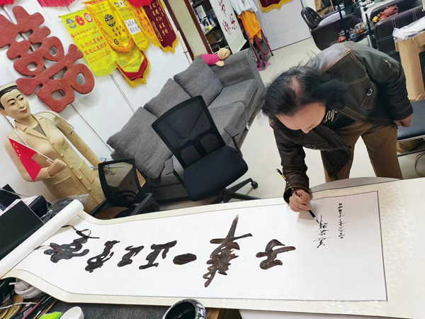 尤其是作為中國著名詞曲作家的姜延輝先生,也是我值得敬佩的名人。姜延輝老師沒有因為自己是知名度很高的名人放不下架子,而是非常樂意為大力弘揚民族發雕藝術的傳承工作做一些自己力所能及的貢獻。人們常說,藝術家必須追求“德藝雙馨”。那么,在我看來,姜延輝老師就是我們值得學習的德藝雙馨榜樣。他沒有架子,是他千里迢迢從北京到成都與民族發雕發明家黃鑫先生面對面共同商討民族發雕書法藝術創作的。也許,是深受姜延輝先生的感動,讓黃鑫先生在發雕創作中突發創作靈感,讓他平心靜氣,一絲不茍,讓自己旁若無人地沉浸到了創作當中。