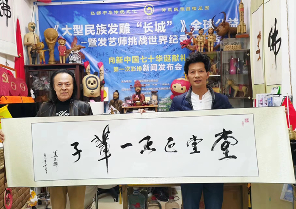 著名詞曲作家姜延輝先生(左)與頭發雕塑發明家黃鑫(右)和發雕藝術作品《堂堂正正一輩子》合影