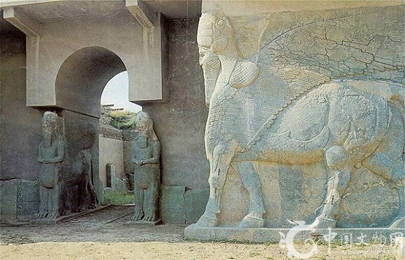 尼姆魯德古城,位于伊拉克摩蘇爾以南。尼姆魯德克古城最重要的建筑物是公元前798年建立的文學之神那波及其配偶的神殿。神殿藏書室及附屬房舍中收有許多宗教和亞述文獻及以撒哈頓的遺囑。外城最重要的建筑物為占地12英畝的軍火庫。從這些建筑物中曾發掘出數千件牙雕,多為公元前9世紀至公元前8世紀作品,是當前世界上最豐富的牙雕寶藏。伊斯蘭國武裝分子從2015年3月5日開始破壞當地古跡。