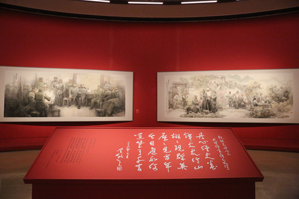 此次展覽著重展出了大型組畫《烽火太行》。2005年,趙志田先生為紀(jì)念抗戰(zhàn)60周年,創(chuàng)作此畫,2015年,他在原畫的基礎(chǔ)上重新構(gòu)圖增加內(nèi)容、篇幅,最終于2019年底完成。《烽火太行》是巨幅歷史組畫,由魚水情深、銅墻鐵壁、共謀抗戰(zhàn)、得道多助、正義之歌、普天同慶六個段落組成。為創(chuàng)作此畫,趙志田先生多次深入太行老區(qū)收集資料,反復(fù)思考構(gòu)圖,多次修改。全畫共刻畫了260多個人物,畫得形似而又傳神。整幅作品宛如一部交響樂。趙志田先生懷揣著揮之不去的“太行情懷”,熔鑄了抗日戰(zhàn)爭中犧牲的父輩給他留下的精神的影響,以及文革后多次深入太行引發(fā)的靈感的跡化,真實地表現(xiàn)了中華民族團結(jié)一致、不受屈辱、反抗侵略的民族精神,呼吁著現(xiàn)在社會更多的年輕人勿忘國恥、以史為鑒,要像先輩們學(xué)習(xí),學(xué)習(xí)民族精神,做國家的脊梁。