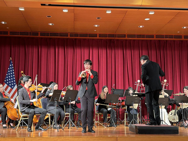 12月15日晚,中國駐美使館宴會大廳迎來了美國巴德學院美中音樂研習院巴德東西樂團(The Bard East/West Ensemble)一場中西合璧的音樂會。蒼勁有力、爆發力極強的嗩吶名曲《百鳥朝鳳》將中國民樂的表現力演繹到了一種極致,將音樂會帶入了掌聲不斷的高潮。當晚音樂會由巴德學院美中音樂研習院院長、東西樂團藝術總監蔡金冬先生指揮,來自中美的青年音樂家聯袂以中西樂器共同演奏了中美兩國的經典曲目。