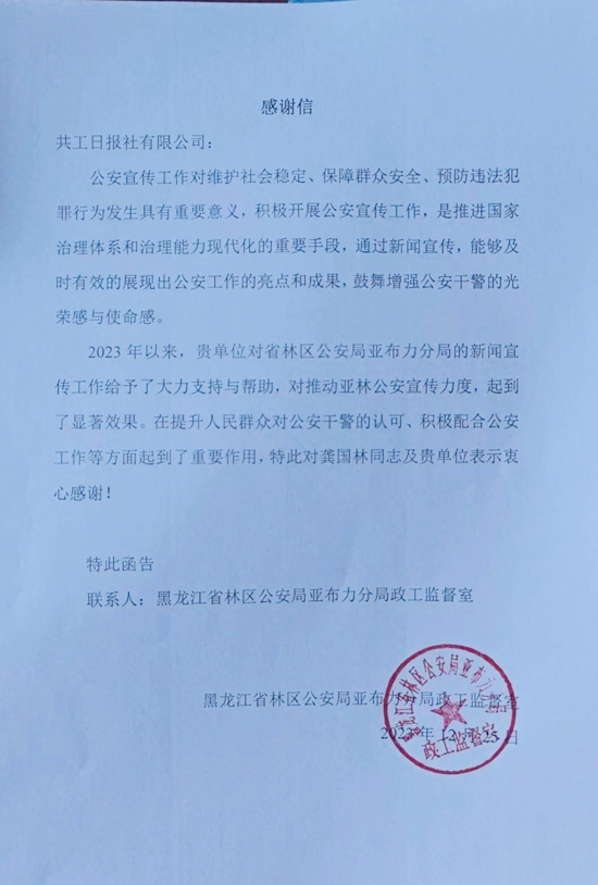 助推公安機(jī)關(guān)新聞宣傳力度!黑龍江省林區(qū)公安局亞布力分局致信感謝共工日報(bào)社