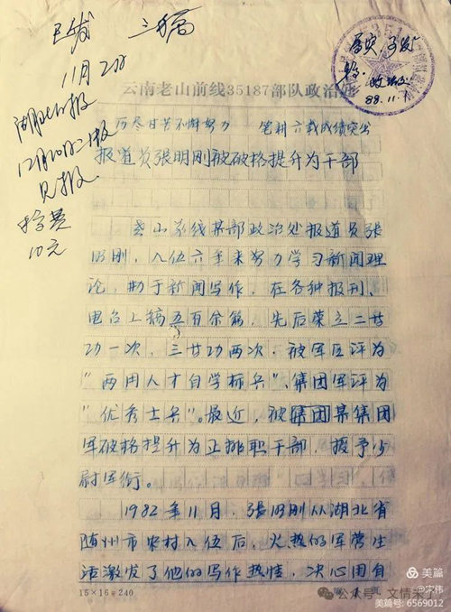 文章來源于2022年10月29日美篇“報道員張明剛被破格提升為干部”。