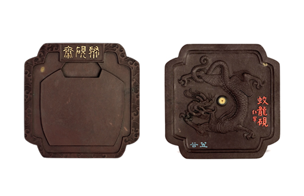 “蛟龍硯”由著名硯雕家吳笠谷先生精心創(chuàng)作而成。整體設(shè)計(jì)為“四水回歸”:硯池采用漢代皇家藏書(shū)樓石渠閣四面環(huán)水的造型,所以又稱四水歸源,硯邊淺刻水波紋,象征現(xiàn)今四大洋,寓意中華文化的偉大復(fù)興和世界的和平安寧。硯額刻篆書(shū)“聚硯齋”三字。硯背浮雕蛟龍戲珠,靈珠為天然石品活眼巧作,象征“蛟龍?zhí)?rdquo;的科考是為了探索海洋科學(xué)這顆璀璨的明珠。著名硯臺(tái)收藏家劉紅軍將軍親筆題銘“蛟龍硯”三字,渾厚端莊,點(diǎn)明主題。這方潛海端硯是繼搭載“神九”的飛天歙硯――“中華飛天第一硯”之后,由中華硯文化發(fā)展聯(lián)合會(huì)推出的又一方具有里程碑意義的名硯,從而譜寫(xiě)了“可上九天攬?jiān)拢上挛逖笞谨M”的硯界傳奇,是當(dāng)代硯文化發(fā)展史上的又一壯舉,可稱為“中華潛海第一硯”。此次是“蛟龍硯”首次與觀眾見(jiàn)面。