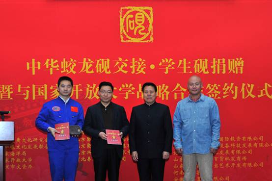 中國(guó)藝術(shù)品理財(cái)網(wǎng)訊 3月16日上午9時(shí),“中華潛海第一硯”蛟龍硯首次在首都北京亮相。中華炎黃文化研究會(huì),中華硯文化發(fā)展聯(lián)合會(huì),國(guó)家開(kāi)放大學(xué)等機(jī)構(gòu)在北京中華硯文化博物館舉行了蛟龍硯交接儀式。