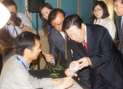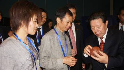 對話會期間第十一屆全國政協副主席、中國文聯主席孫家正先生,參觀了紫砂藝術,對紫砂文化傳承保護與發揚光大給予重要關切,高度評價了宜興市國禮紫砂藝術研究所所長汪成瓊的藝術水準,并對他去年北京APEC峰會中所作出的貢獻給予充分肯定,寄望他多出紫砂藝術精品,承載更多更優秀的中華文化精髓,為中國文化走向國際多做貢獻!