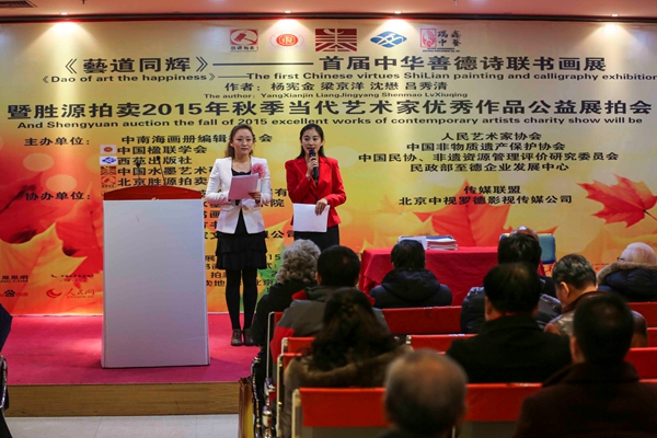2015年11月28日上午9時30分,由中南海畫冊編輯委員會、中國楹聯學會、西苑出版社、中國水墨藝術研究院、北京勝源拍賣有限公司聯合舉辦的藝道同輝——首屆中華善德詩聯書畫展在北京高碑店國粹苑隆重開幕。