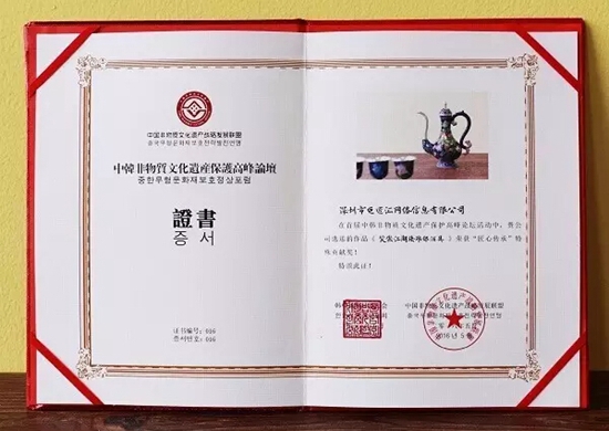 經過組委會嚴格品評篩選,巨匠匯琺瑯銀茶具和琺瑯銀酒具在中韓藝術大師作品突出重圍,均榮獲逸品神工獎和匠心傳承特殊貢獻獎!