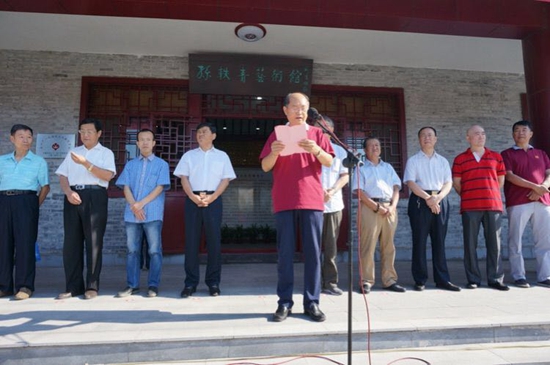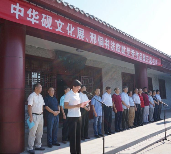 9月8日上午,由中華炎黃文化研究會硯文化聯合會、山東省樂陵市委、市政府共同舉辦的2016樂陵市中華硯文化展覽,在樂陵市孫軼青藝術館隆重開幕。中華炎黃文化研究會硯文化聯合會常務副會長張國興、劉克唐、金彤、蘇文源,副會長火來勝、傅聿勝、馮明躍,以及專委會專家陳國源,常務副秘書長于忠文、李杰、陰巍等20余人組成代表團出席開幕式。參加開幕式的還有,解放軍報社原社長、孫軼青先生之子孫曉青將軍,樂陵市委書記曲峰和市人大、市政府、市政協,市直機關、各鄉鎮領導,參加明代書法家邢侗書法臨帖展的書畫家,以及社會各界群眾共200余人。張國興副會長代表聯合會和劉紅軍會長致開幕詞,蘇文源副會長代表聯合會向樂陵市中小學校捐贈300套學生硯,金彤副會長向樂陵市孫軼青藝術館贈送劉紅軍會長題字“硯緣”。