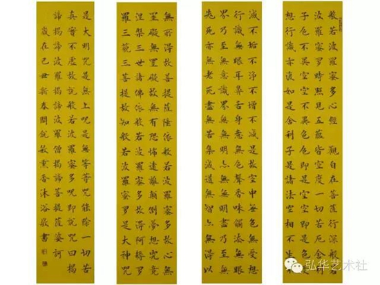 橫披指橫幅作品,橫長豎短。這種格式可以寫少數字,自右而左寫一行,也可以橫式直寫形成多行書長篇字。橫披大的可用于建筑物上、大廳會議室中懸掛,小的可用于齋室布置。