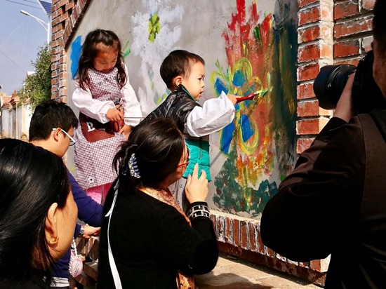午飯后美術小天使們開始揮動手中的畫筆濃彩重抹,在修繕一新的墻壁上作畫。武家莊是張家口市下花園區所管轄的一個村莊。顧名思義,這里春夏之季山花爛漫,美不勝收。所以組委決定以十三個冬奧舉辦國的國花作為世界兒童美術村的開局題材。在老師的安排指導下,在家長的幫助配合下,美術小天使們個個興致勃勃,經過四個小時的努力奮戰,一朵朵天真稚拙的巨大花朵駐顏墻壁。同時,當天村里也挑選了六位喜愛繪畫的小朋友參與了交流創作活動,將他們心中最美的花朵綻放到了家鄉的墻壁上。美化后的墻壁街景讓人眼前一亮,贏得了人們交口稱贊。