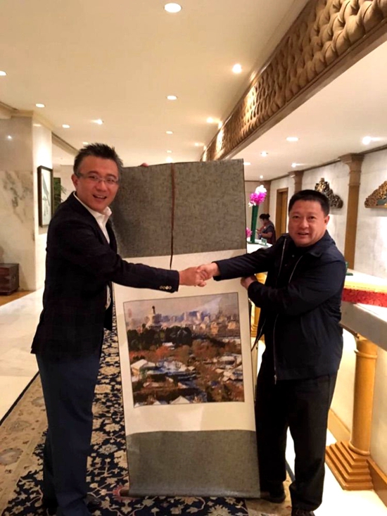 董方軍會長向香港天天向上基金會主席應琦泓先生贈送于江老師創新的光影平面油畫作品
