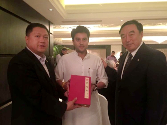 董方軍會長向印度國大黨黨鞭、瓜廖爾城邦君主、辛迪亞王子贈送由“聚硯齋”榮譽出品的精品硯臺。