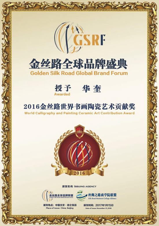 年會舉行了精彩的頒獎盛典儀式,組委會為楊元惺先生頒發(fā)“2016金絲路全球·世界攝影文化藝術(shù)貢獻(xiàn)獎”,為華奎先生頒發(fā)“2016金絲路全球·世界書畫陶瓷文化藝術(shù)貢獻(xiàn)獎”,以表彰兩位藝術(shù)家在“絲綢之路”攝影與書畫瓷器藝術(shù)方面的貢獻(xiàn)。