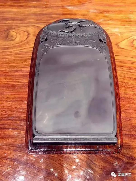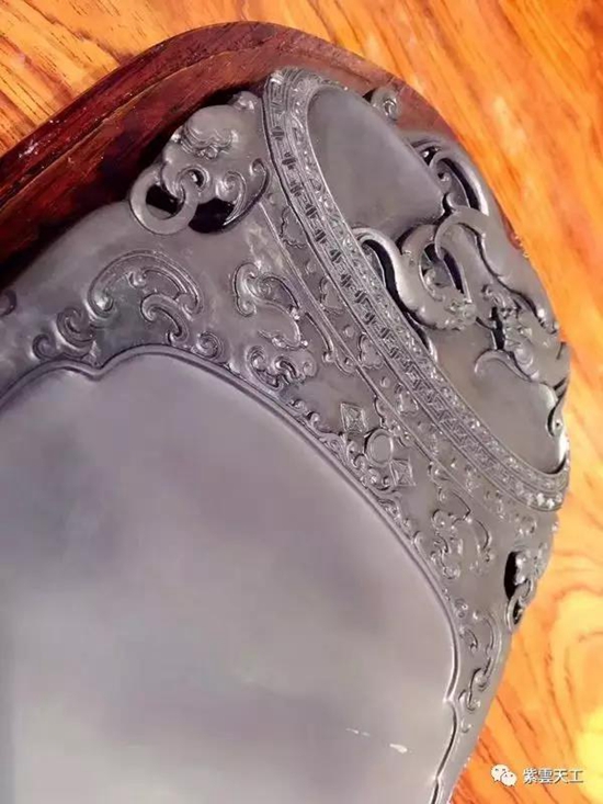 此硯選料上好老坑,整個硯堂被碩大的魚腦凍貫穿,且布滿老坑優秀石品青花、冰紋和火捺,在一方老坑中能聚集如此優秀的石品實乃罕見。整方硯石呈現老坑特有的紫中帶青灰色,硯四周雕刻了中國傳統紋飾——云龍,線條雕刻厚重,有“明代”之風,工藝細膩、精致。