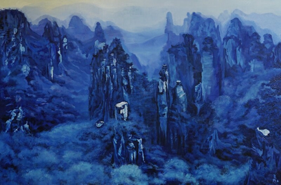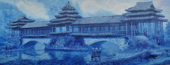 深沉鮮活的中國青花瓷文化是最能代表中國傳統(tǒng)文化的意象之一。作者以田野式調查方式與非遺文化視覺深入湘西,用傳統(tǒng)青花意象觀照今日時代巨變的湘西,表現(xiàn)湘西風光,記錄湘西人文,傳承湘西非遺成果。一方水土養(yǎng)一方人,湘西文化在幾千年的發(fā)展歷程中,大量的非物質文化遺產符號和當?shù)刈匀晃幕z產緊密相聯(lián),在人們的生活方式中和諧發(fā)展,逐漸形成了獨特的湘西文化遺產譜系。在人們審美多元化的今天來欣賞青花非遺油畫作品的確給人一種視覺和精神上的滿足感,其劉家樣個性風格的藝術手法以其精準的造型、高雅的色彩、個性化的筆觸、精湛的制作技藝、奇特的創(chuàng)意以及全新的觀念,描繪出了湘西如詩如畫的古村落、古剎、風雨橋、民居,街市;以及畫面里出現(xiàn)的人物形象,織藝印染,金銀頭飾都能和諧完美地傳達出一種古韻今輝的時代表情。其立意之高遠,內容之豐富,歷史之久遠,符號之多樣,技法之全面為中國畫壇之首創(chuàng)。