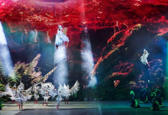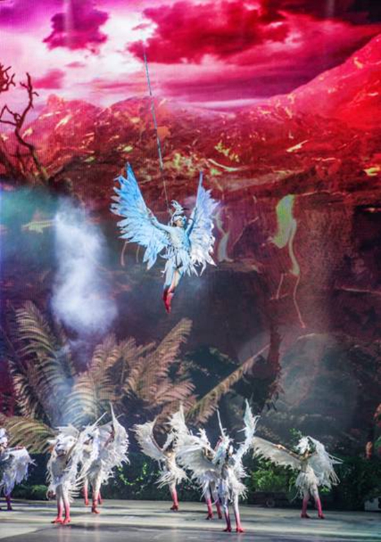第一幕:天造鷺島。故事散點式展開,橫貫舞臺的巨大山體在震耳欲聾的音樂中向兩側(cè)裂開,首先吸引眼球的是大、小恐龍的幽默表演和雨林冰川的變化喻意海進海退、潮起潮落的滄桑巨變,群鷺翱翔天際喻意鷺島的形成。