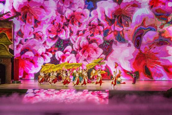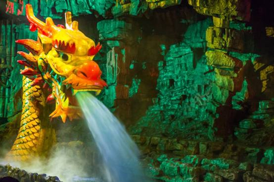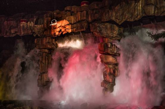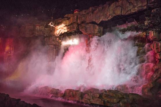 第五幕:龍的傳人。鼓聲陣陣,祭祀祈福,載歌載舞,玄幻夢幻,伴隨從天而降的滔天巨浪,2000噸水從天而降,營造黃河之水天上來的宏偉氣勢,17米的巨型金龍騰空而起,水霧噴出,歡聲雷動。