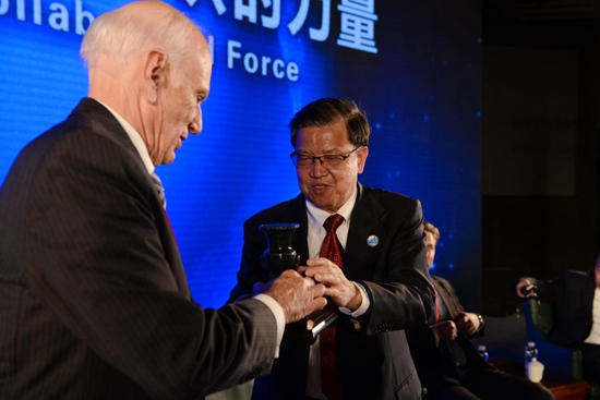 原外經貿部副部長、博鰲亞洲論壇前秘書長龍永圖(左),將中國尊贈與聯合國副秘書長吳紅波(右)