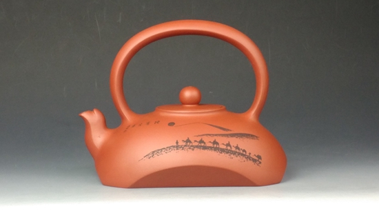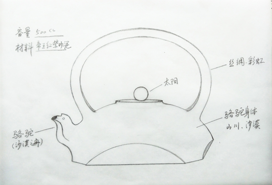 王維的詩(shī)句“大漠孤煙直,長(zhǎng)河落日?qǐng)A”,勾勒出一幅塞外風(fēng)光。此壺“天圓地方”,提梁宛若蒼穹,寓意萬(wàn)物通達(dá),天人合一;壺嘴與壺身為沙漠之舟,壺鈕比作太陽(yáng),提梁喻為馱載的絲綢,寓意陸上絲綢之路。駱駝在沙漠中像凌波劈濤的航船,接受人類的使命,用堅(jiān)毅的腳掌踏出了一條連接歐亞的“絲綢之路”,還蘊(yùn)育出了以“胡漢”相融為特色的漢唐文化。