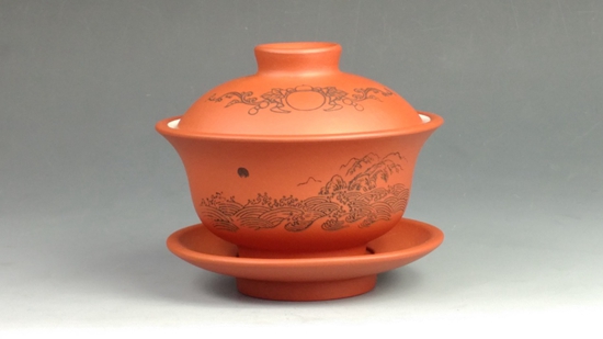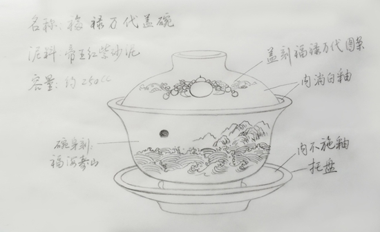 傳統(tǒng)式,蓋為天、托為地、碗為人,暗含天地人和之意。碗身雕刻福山壽海圖,象征大江大河、波濤翻滾海浪,江山如此多嬌;碗蓋配以福祿(葫蘆)圖,五個(gè)葫蘆與綢帶、藤蔓纏繞,寓意福通五洲、和諧共融。