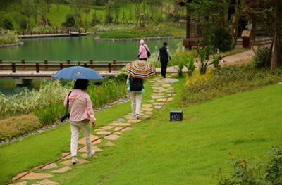 圖6 微雨中,朋友們漫步在“中國儺城”景區前的濕地公園內。這里綠草如茵,一派詩情畫意
