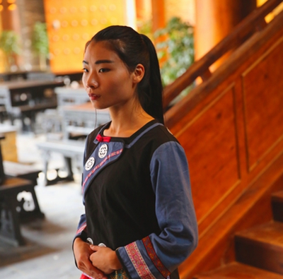 圖12 在“茶山花海”看到的仡佬族美女(也是此次活動中近距離接觸到的第一個“原生態仡佬族美女”),個人形象不輸于潘倩,但遺憾的是服飾已經完全漢化。如果她也能像下圖中潘倩那樣,引領仡佬族儺戲歌舞,那必將是極具吸引力的!