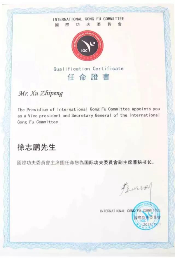 世屹文化董事長徐志鵬先生當選國際功夫委員會副主席兼秘書長