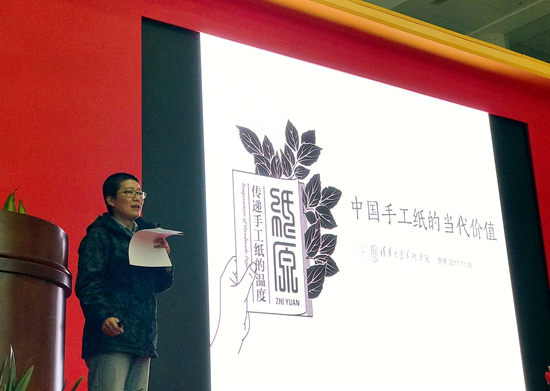 中國非遺藝術設計研究院手工紙藝研究所所長,清華大學美院,視覺傳達設計系副教授袁博老師發言,造紙術的發明為知識的傳播、文明的發展奠定了必要的物質載體和技術途徑,是中國古代科技對世界文明的重要貢獻。今天,手工紙將通過其在藝術、設計、教育、旅游、文化交流等多領域的延伸,創造其為價值塑造、為生活日用、為匠心傳承的當代價值。