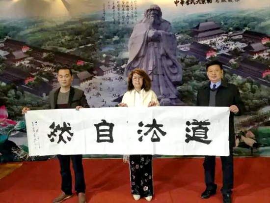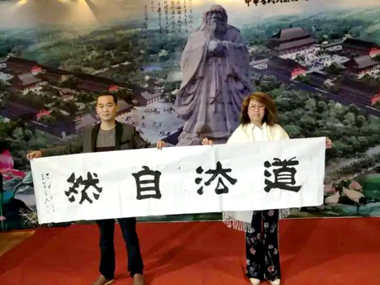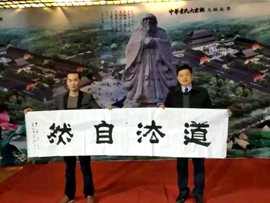 中國天成大學河南省級學院院長李昱柯向邵金龍總經理贈送書法作品:“道 法自然”預祝親親健康醫療互聯網+金融戰略合作平臺早日建成運作。