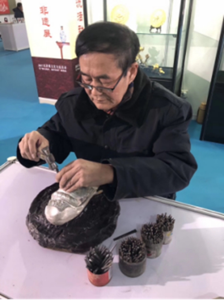 張永寬老師在展會(huì)期間,進(jìn)行鏨刻技藝的展示,通過(guò)錘子輕重適宜的敲打鏨子,將紋飾刻畫(huà)在金銀器的表面,增加作品藝術(shù)感染力,詮釋著大國(guó)工匠的魅力。