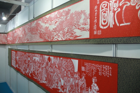 康剛老師用紙刻成的清明上河圖、紅樓夢(mèng)作品亮相本次展會(huì)
