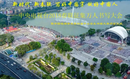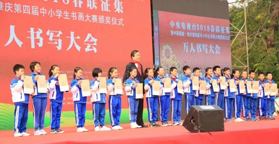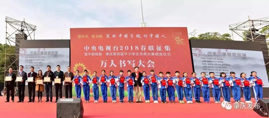 2017年12月23日上午,肇慶市龍禧小學選派的200名小書法家,參加主題為:“新時代,新春聯,寫好中國字,做好中國人”中央電視臺2018春聯征集萬人書寫大會,在全國政協常委、中國書法家協會主席蘇士澍及其100名中國書協理事帶領下,與肇慶市13000多名中小學生現場揮毫潑墨,國家首批重點風景名勝區--七星巖牌坊廣場翰墨飄香、氣勢恢宏。