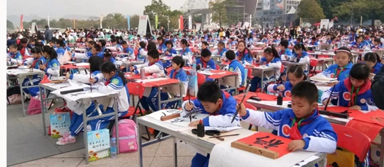 200名肇慶市龍禧小學學子與100位中國書法家協會理事同臺潑墨揮毫,情景溫馨。