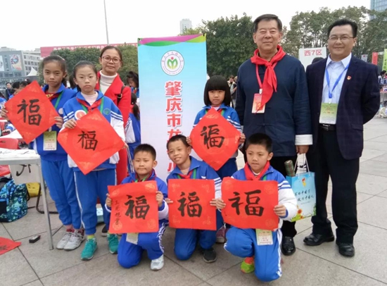 廣東省政協主席王榮為中國硯都肇慶第四屆中小學生書畫大賽獲獎學生代表—肇慶市龍禧小學小書法家們頒獎