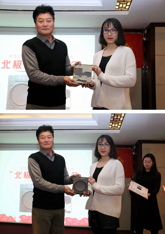 中華硯文化博物館館長(zhǎng)于忠文、聯(lián)合會(huì)辦公室主任李杰展示北極硯