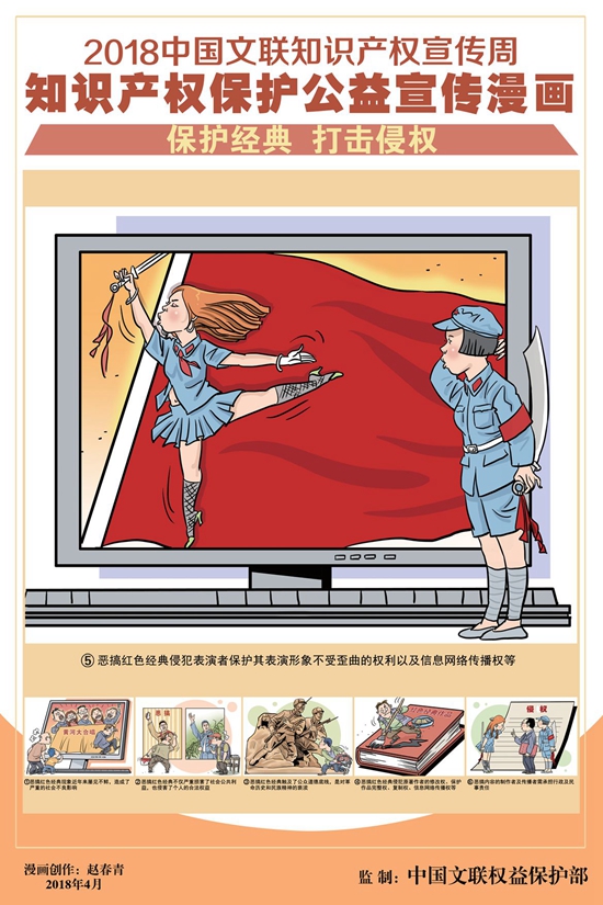 據悉,2018年“4·26”世界知識產權日前后,中國文聯權益保護部再次組織舉辦“中國文聯知識產權宣傳周”系列活動,通過聯合社會權益保護組織共同建立文藝版權服務機制、舉辦知識產權講座、制作張貼知識產權宣傳海報、線上線下多平臺開展普法宣傳等豐富多樣的形式,集中進行知識產權相關法律知識的宣傳和普及活動,力爭在文聯組織和文藝界,乃至全社會進一步營造尊重文藝創作、尊重知識產權、促進知識產權保護和運用的良好氛圍。