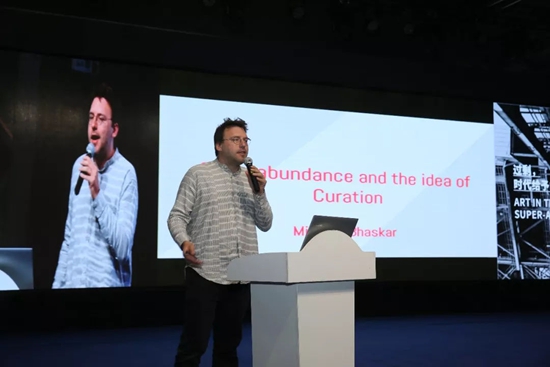 凱倫·史密斯館長邀請了第一位發(fā)言人上臺演講。首先發(fā)言的嘉賓是一名來自英國著名的作家、數(shù)字出版人以及企業(yè)家邁克爾.巴斯卡爾,他從時代各種過剩的現(xiàn)象為切入點,表達了他對策展“這個詞的獨到見解。他認為處在全球化、科技發(fā)展的時代進程中,社交媒體以及信息大爆炸式的發(fā)展必然導(dǎo)致人類生活方式的改變,這種巨大的社會變革重塑了”策展“的使用語境,策展人通過篩選信息并有效利用就可以創(chuàng)造更多的價值。