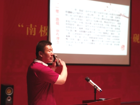 常務副會長張國興就“南極硯”及“一帶一路硯”有關情況作了介紹。本次“南極硯”暨“一帶一路硯”發布會,是中華炎黃文化研究會硯文化委員會自2012年以來陸續推出“飛天硯”、“蛟龍硯”、“南、北極硯”、“一帶一路硯”等系列中華名硯的大匯聚。2012年中華炎黃文化研究會硯文化委員會設計制作的“飛天硯”隨“神九”上了天;2014年又設計制作“蛟龍硯”隨“蛟龍號”下潛5200米深海,實現了中華硯臺上天、下海的歷史壯舉。黨的十八以來,黨中央制定出建設社會主義文化強國戰略,習近平總書記提出大力弘揚中華優秀傳統文化創新性發展指示精神。為積極響應和貫徹落實黨中央和習總書記號召,2017年,硯文化委員會以中國特色社會主義文化創新發展主題,開展了“南、北極硯”與“一帶一路硯”的研發創作。