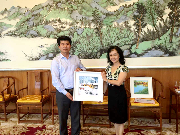 光影平面油畫學會秘書長黃中先生向曼谷中國文化中心主任藍素紅女士贈送于江會長光影平面油畫