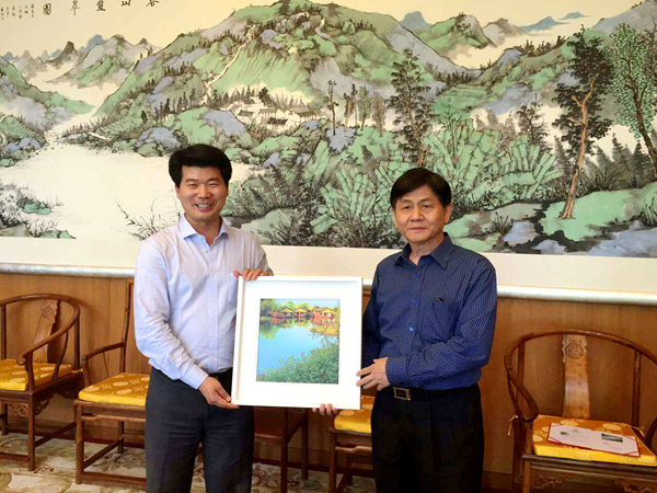 黃中先生向曼谷中國文化中心高級顧問、駐泰使館文化參贊秦裕森先生贈送于江會長光影平面油畫