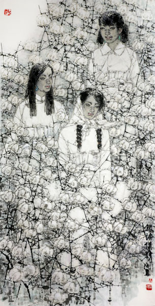 閻真先生的畫作從題材內容是本土性的,他一直執著于太行山山民的表達,他在題材內容中提煉并形式化了表達語言要素,同時又在此基礎上深化了主題內容。其作品是在成為自律性的作品之后,才同他所摯愛的太行山山民(包括古代仕女)發生聯系的;只有當他的作品具有形式自律性之后,其作品中的主題表達出的情感和愛才得以成立。