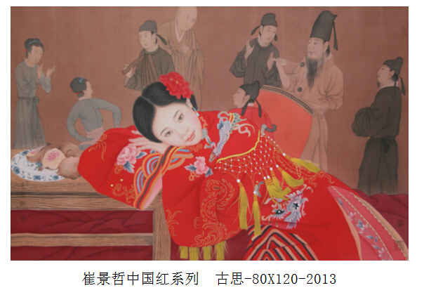 2008年,崔景哲于奧運期間在水立方展覽“中國紅”系列作品。“中國紅”系列作品一面世便受到各大藏家的青睞。或手握書卷臨床而立,或斜倚桌角獨自沉思,或端坐于位、盡顯閨秀風范,或雙眸含水、嬌羞待嫁,或輕撫衣裳、活潑盡顯等等神態各異的紅衣古典人物無不折射出他對中國傳統文化的深刻領悟,演繹著他對儒、釋、道文化的圖解,具有十分豐富的藝術想象力和表現力。其作品融入了西方油畫,中國雕塑,壁畫等技法,形成了他淡雅娟秀、立意高古的藝術風格。他在作品中流露出的對藝術執著追求的真誠。因此,他的作品可以感動觀眾,可以引得藏家的追隨。