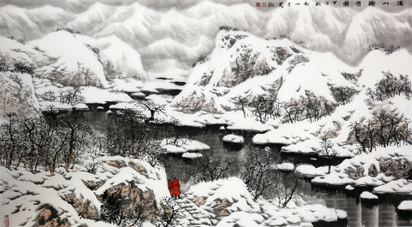 趙春秋先生的冰雪山水畫作,其山水取法于中國古代山水諸多大家,巧妙的將各家之長融匯到自己的作品當中;同時在圖式方式上又吸收了西方繪畫構圖的元素,將西方構圖方式與中國傳統構圖方式融合運用,整個畫作呈現出一派白雪皚皚、千里冰封的壯美景象,使觀賞者仿佛置身于茫茫雪原中,其一望無垠的博大深深震撼著我們的內心。